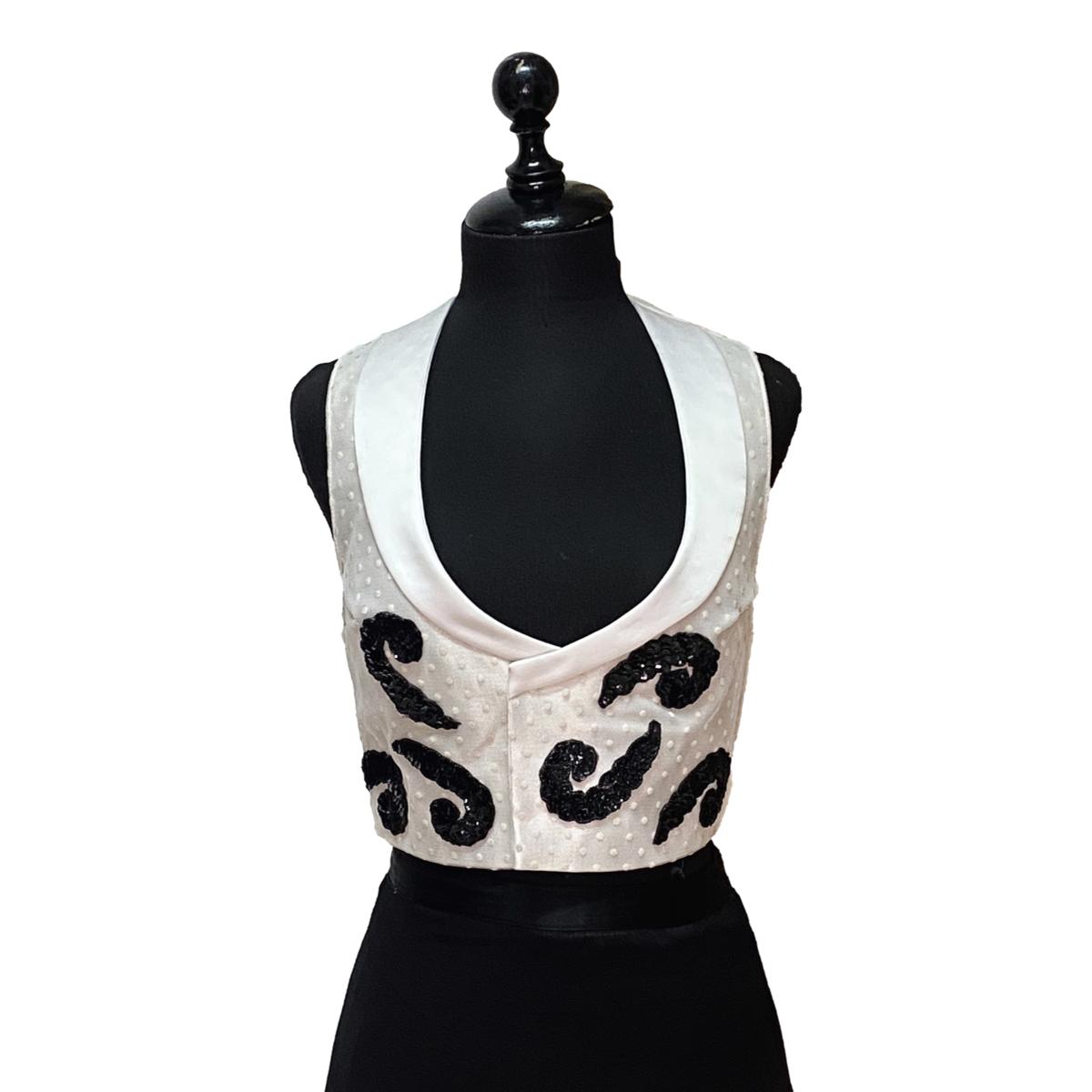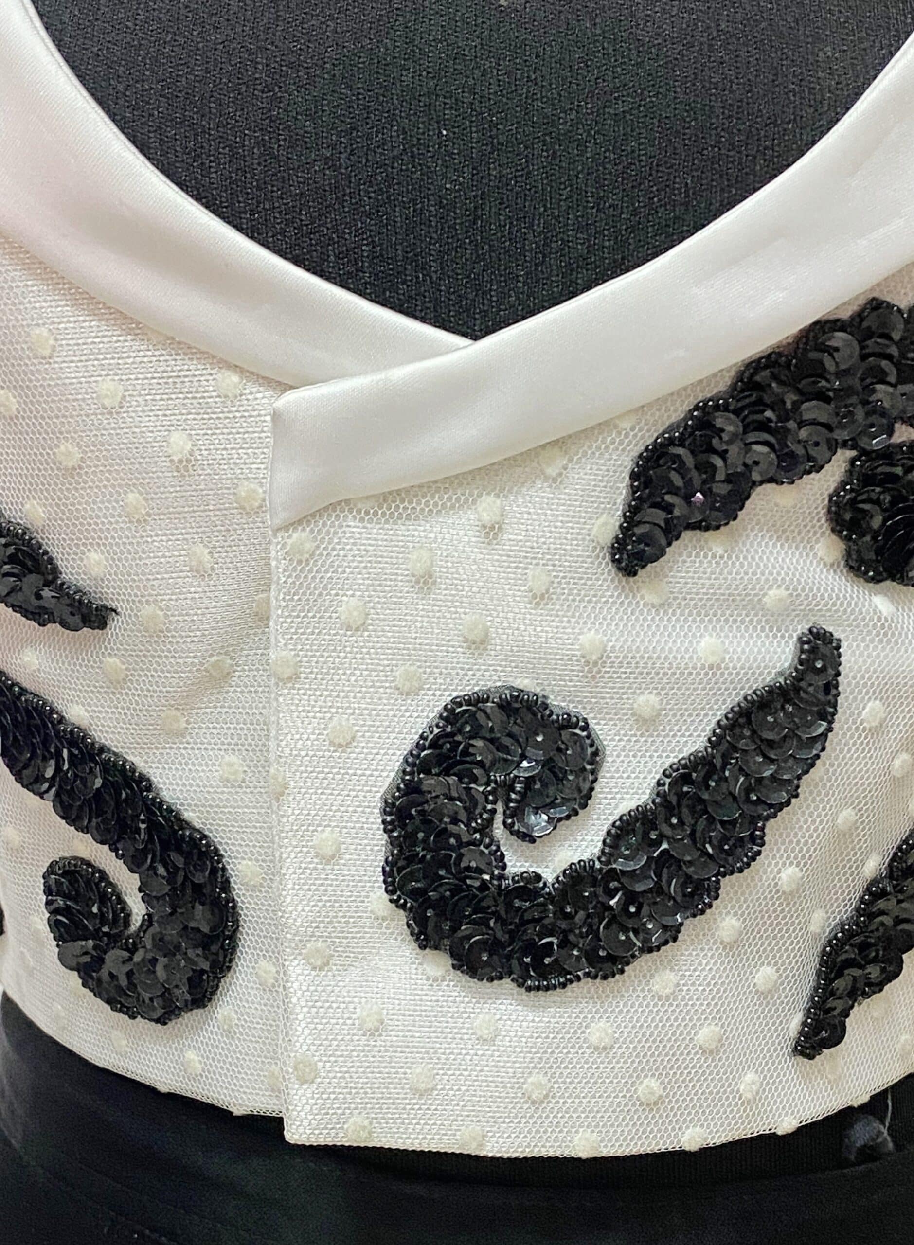 Plumeti blanco,forro mezcla,apliques negros de lentejuelas.