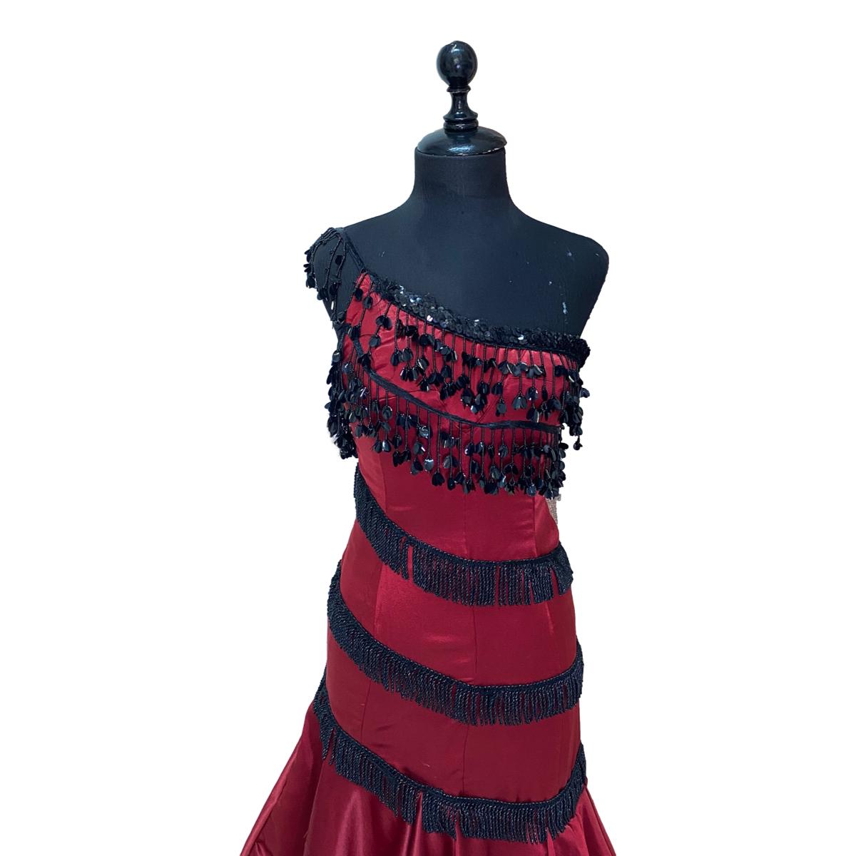 Satén granate, pasamanería, tira de fleco de lingotes negro,tira de flecos de lentejuelas y canutillos azabache.